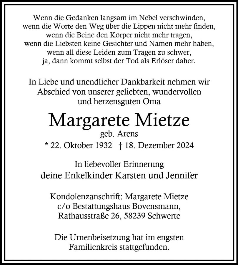 Margarete Mietzegestorben am 18. Dezember 2024